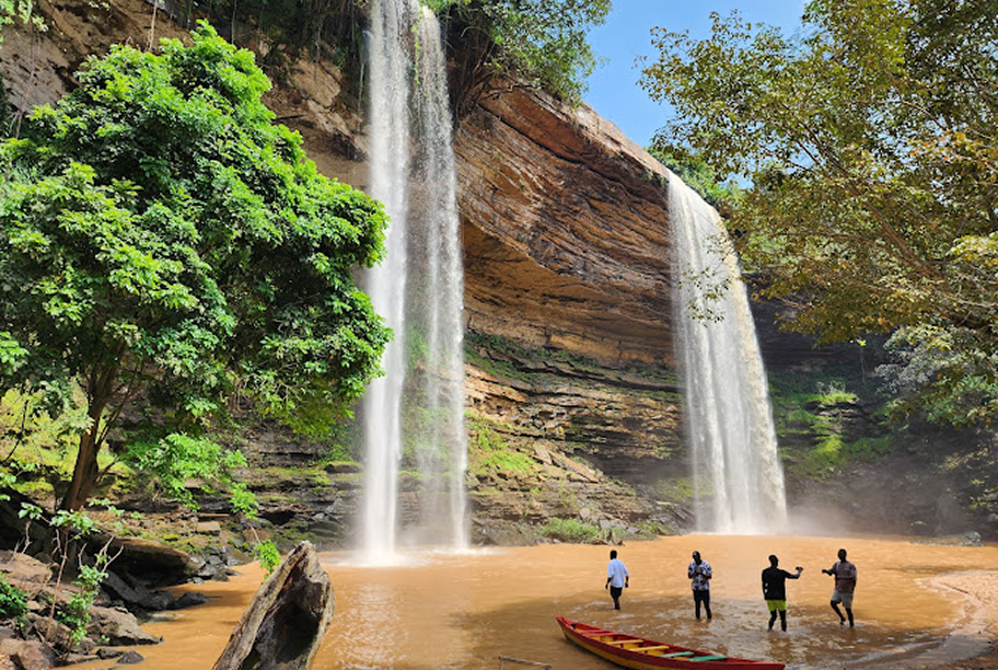 Boti Falls is a twin waterfall located at Boti in Yilo Krobo District in the Eastern Region of Ghana. These twin falls, which come from two rivers, are referred to as female and male; according to local myth, a rainbow is formed when they merge.